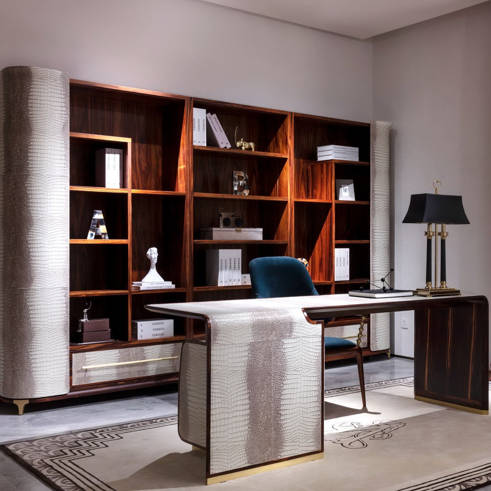 The frame is structured in rich rosewood, a noble wood prized for its grain and strength. Wrapped in light-colored crocodile embossed leather, the desk gains bold texture, soft tones, and a distinctive character that enhances any luxury office interior. This refined detailing transforms the piece into more than a desk—it becomes an expression of exclusivity.