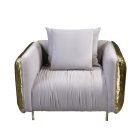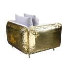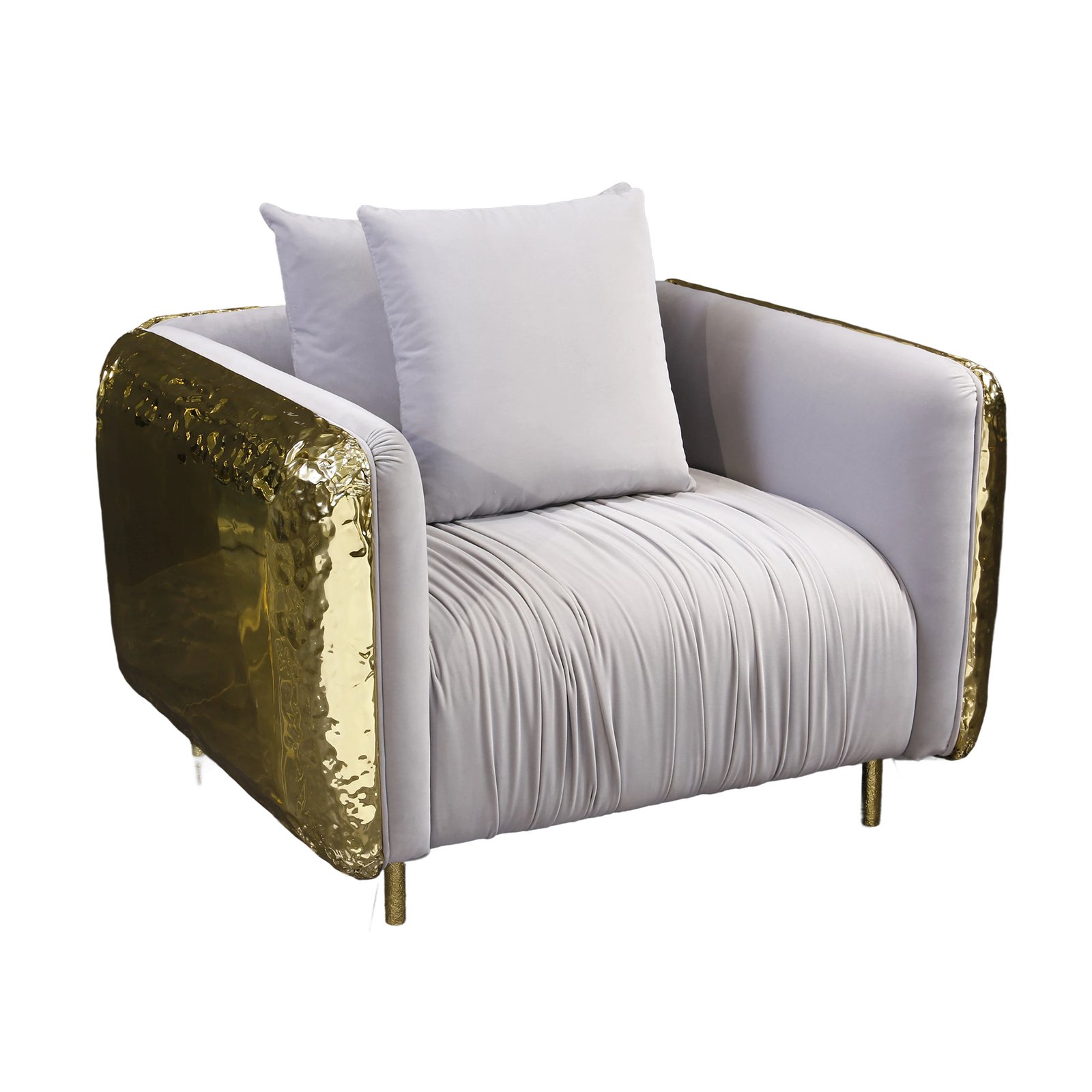The generously cushioned seat and backrest, upholstered in plush velvet or premium leather, provide rich comfort and a tactile contrast to the hard, reflective brass structure. Together, they form a harmony of contrast: soft and strong, refined and raw, structured and sculptural.