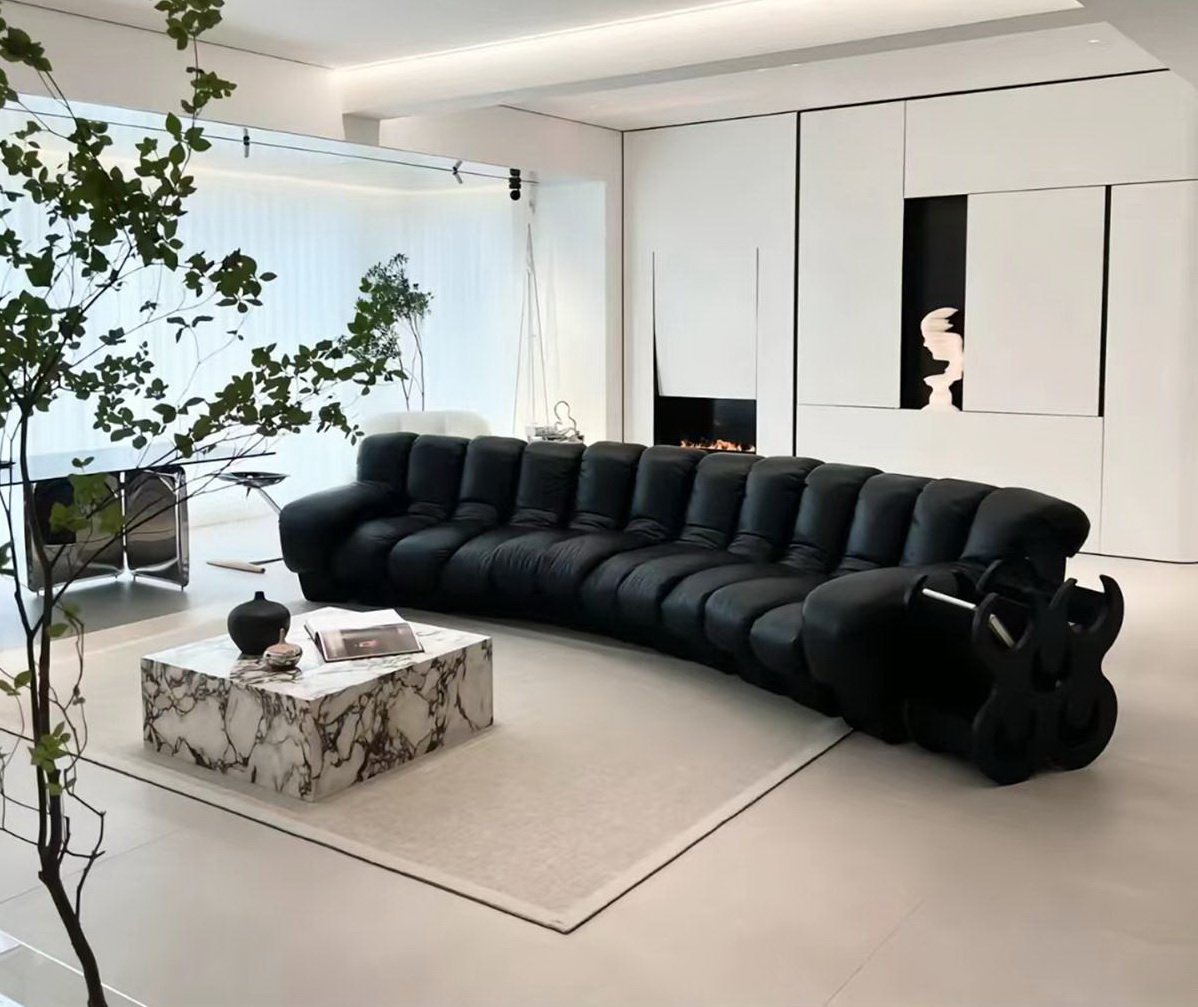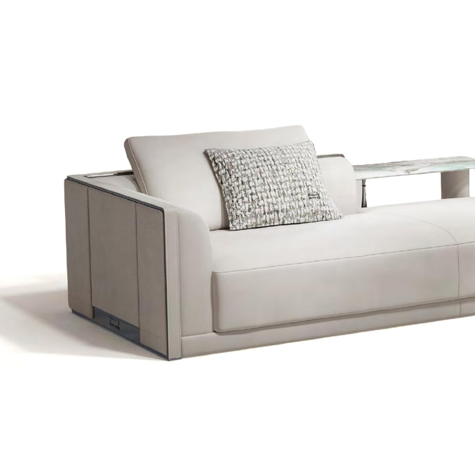This L-shaped sofa is crafted with soft yet resilient matte leather, giving it long-lasting durability that stands the test of time. The seat cushions are filled with premium high-resilience foam, providing the perfect balance of comfort and dependable support that every user desires. Clean, straight lines define its structure, while the understated white tone offers timeless simplicity and elegance. At the center of the sofa, a built-in natural marble shelf provides a stylish and convenient spot to place items like your phone or a drink.
