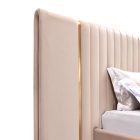 The bed features a tall upholstered headboard wrapped in premium leather, admired for its smooth touch, durability, and rich character. Vertical paneling across the headboard enhances its sculptural lines, while brass inlays add subtle warmth and contrast. These golden accents elevate the design, ensuring the bed stands out as a centerpiece of contemporary luxury.