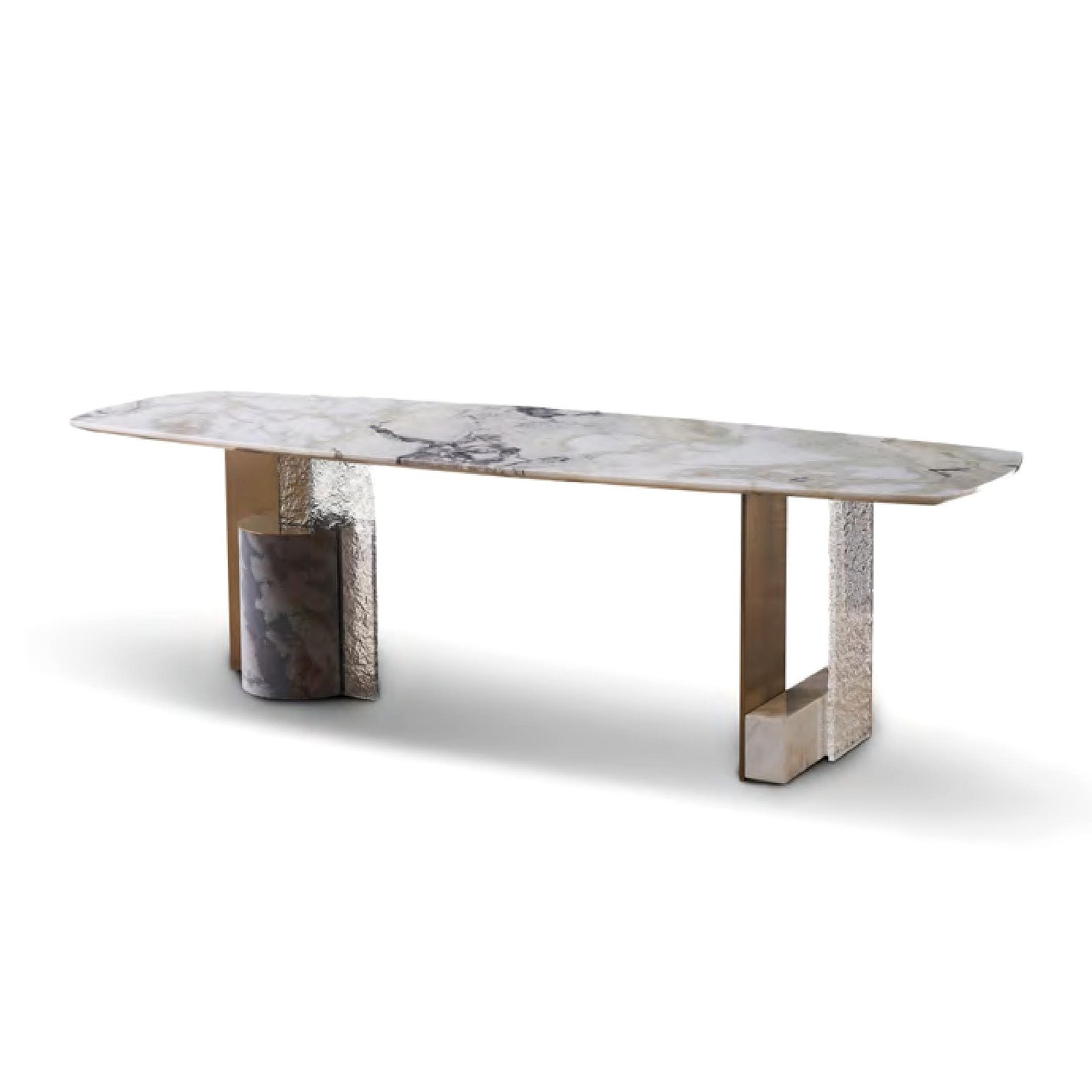 The result is a dining table where the vintage allure of metal, the earthly presence of stone, and the radiant dynamism of glass converge—offering a design that is not only visually arresting, but one that invites admiration and conversation. An unforgettable centerpiece for any luxury dining space.