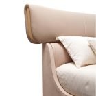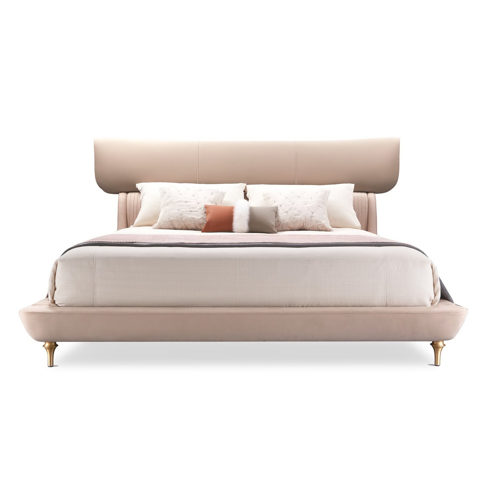 At its core, the bed features a curved upholstered headboard, designed with soft flowing lines that add harmony and elegance. The gentle arc creates a cocooning effect, inviting rest while serving as a dramatic architectural statement.