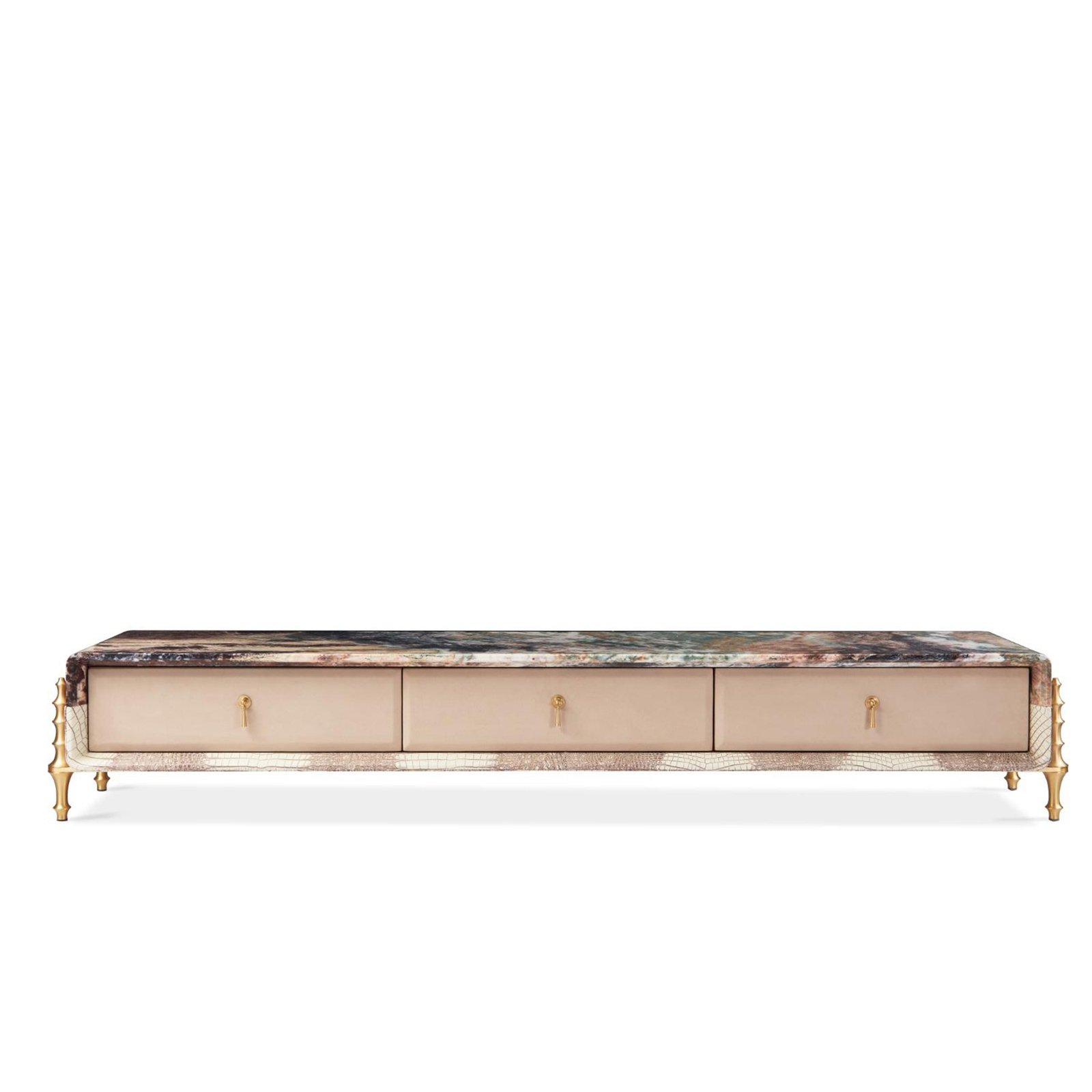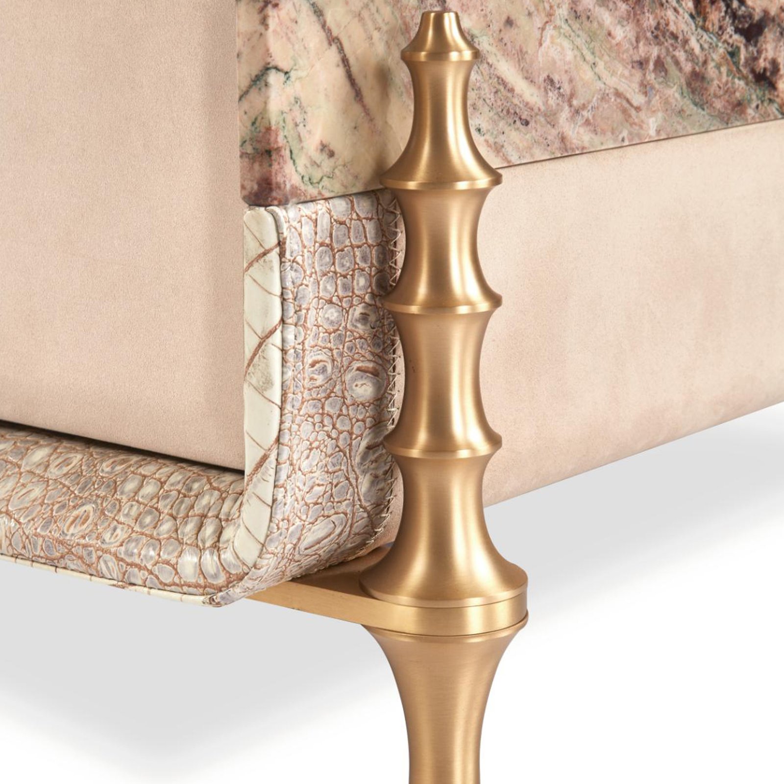 An upscale coffee table crafted from natural marble, crocodile embossed leather, and premium brass legs—designed as a striking centerpiece for refined modern interiors.