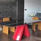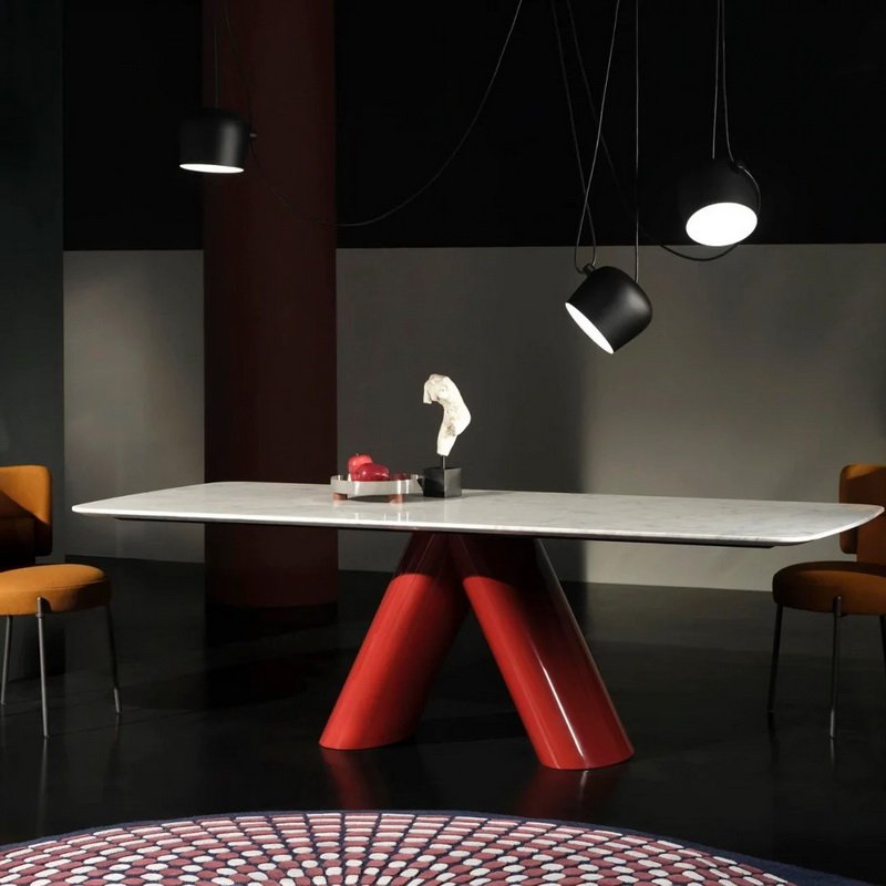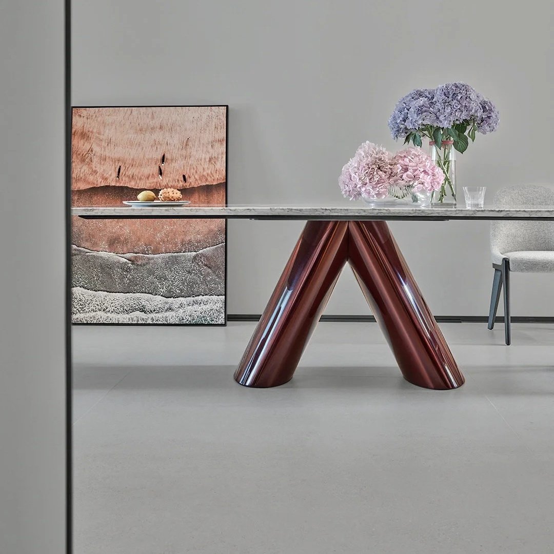 The Viva Dining Table instantly catches the eye with its bold red V-shaped base. This sculptural foundation commands attention and adds a confident splash of color to any room. In the right interior, it becomes a striking centerpiece that blends art and function.